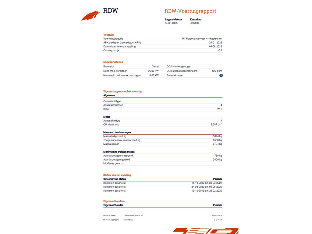 | Kilometerstand | Bouwjaar | Vermogen | Brandstof | Transmissie | BTW |