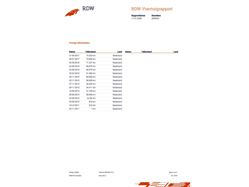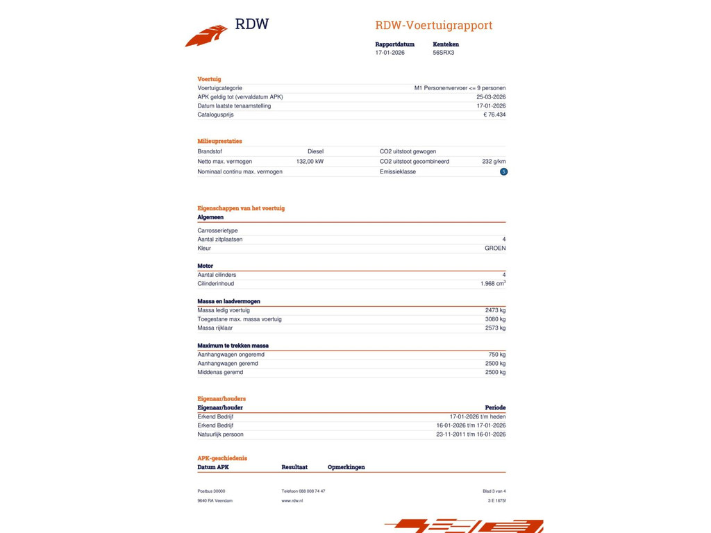 | Kilometerstand | Bouwjaar | Vermogen | Brandstof | Transmissie | BTW |